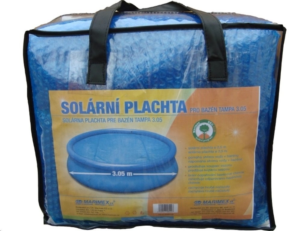 Modrá solární plachta Marimex pro bazény s vodní hladinou o průměru 2,5 m je vyrobena z polyetylenového tepelně izolačního materiálu. Bublinky v plachtě fungují jako čočky a ohřívají vodu s pomocí slunečního záření. Tepelně izolační materiál navíc zpomalí ochlazení vody přes noc.
