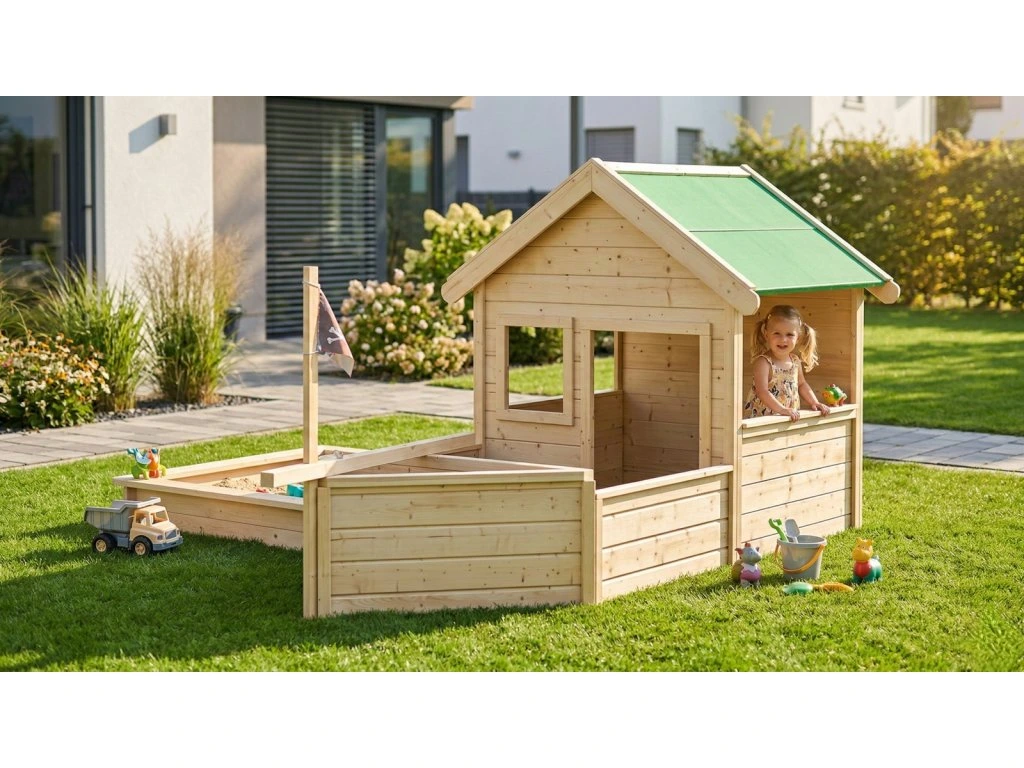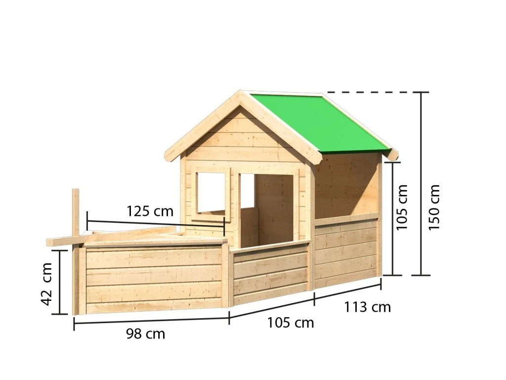 Pirátský domeček KARIBU JACK je zajímavý velmi jednoduchou a rychlou stavbou. Díky prefabrikovaným stěnovým prvkům z desek z masivního dřeva o tloušťce 14 mm a střešní konstrukci z lehce a rychle položených dřevěných desek stojí domeček během chvilky. Střecha je pokryta zelenou střešní fólií. Velkorysé otvory na bočních stěnách a dveřní a okenní otvory v přední části nejsou z bezpečnostních důvodů uzavřeny. Výška boční stěny je 105 cm a celková výška 150 cm. Vaše děti budou milovat domeček milovat kvůli dobrodružství i velkorysému vnitřnímu prostoru. Zvláštním prvkem domečku pirátská přístavba - příď, která ohraničuje pískoviště. Tato pískoviště může být zakryto dřevěnou deskou a chráněno před kontaminací listy nebo sousedovic kočkou. Před pískovištěm je vpředu další sloupek pro montáž pirátské vlajky (ta není obsahem dodávky).