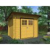 Srubový zahradní domek s pultovou střechou ze síly stěny 28 mm. Naimpregnovaný základový rám je součástí výrobku. Můžete si přiobjednat palubkovou podlahu o síle 19 mm. Střecha je tvořena pohledovými smrkovými palubkami a standardně dodávanou střešní krytinou je nenasákavá lepenka V13. Domek obsahuje palubkové dveře s 1/3 prosklením.