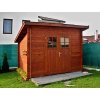 Zahradní nářaďový domek o síle stěny 28 mm. Naimpregnovaný základový rám je součástí výrobku. Můžete si přiobjednat palubkovou podlahu o síle 19 mm. Střecha je tvořena pohledovými smrkovými palubkami a standardně dodávanou střešní krytinou je nenasákavá lepenka V13. Domek obsahuje palubkové dveře s 1/3 prosklením.