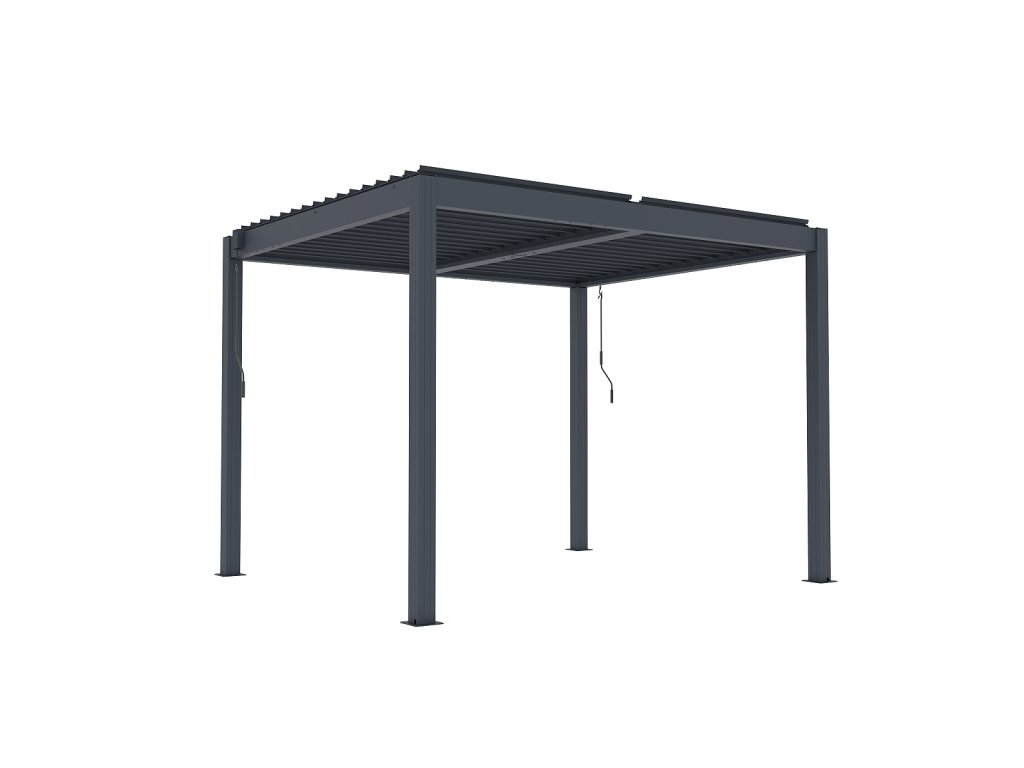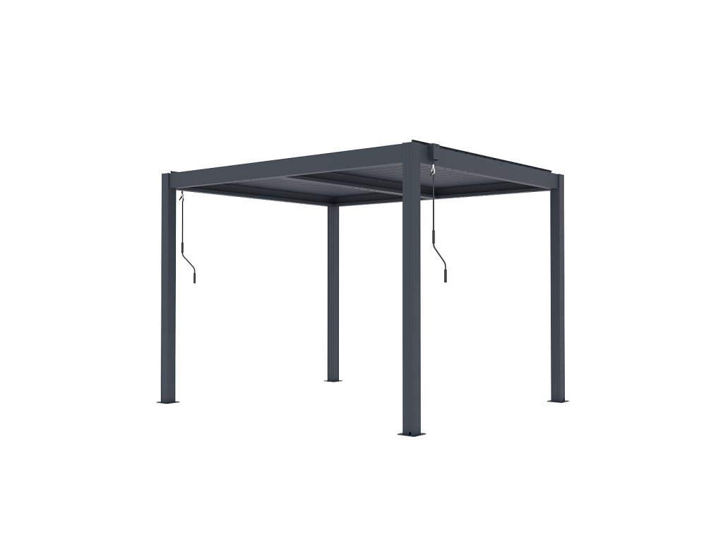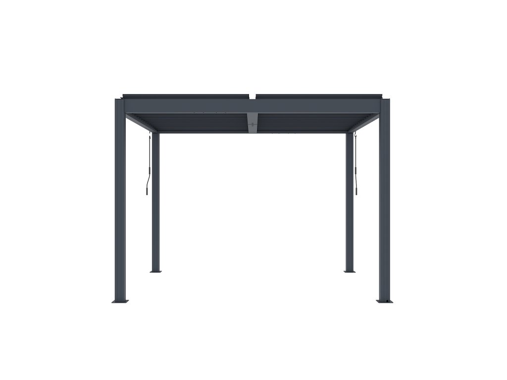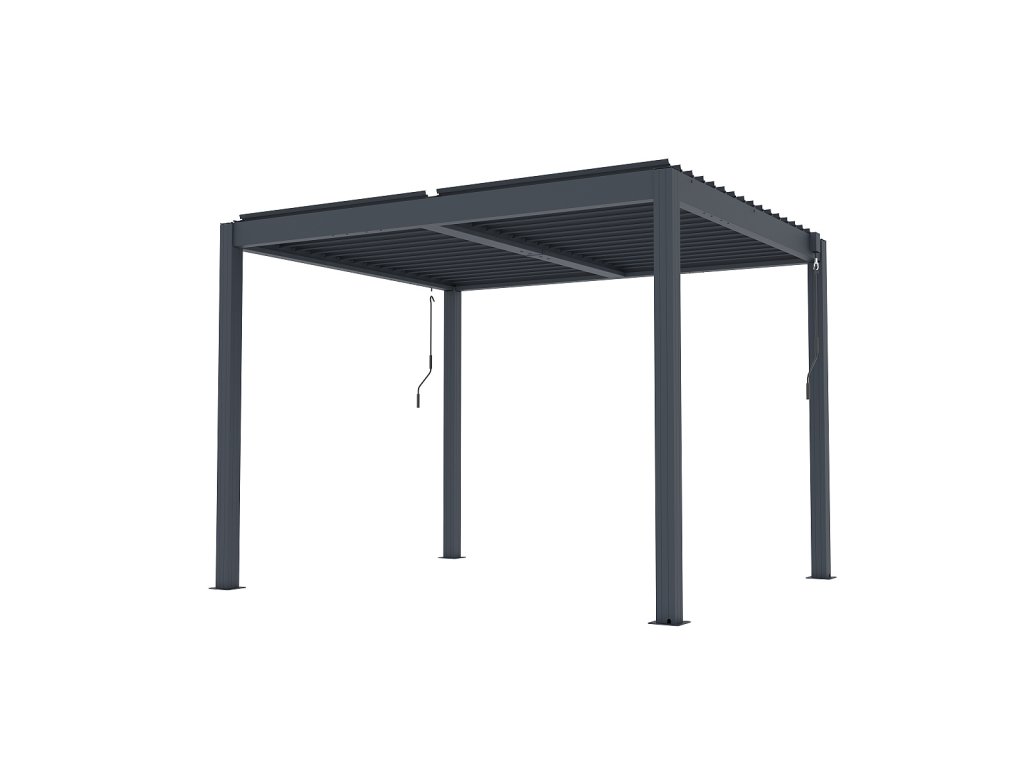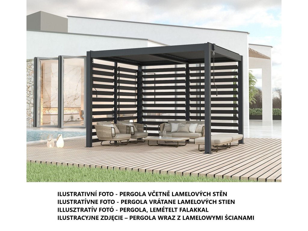 Volně stojící bioklimatická pergola LANITPLAST BASIC o rozměrech 3 x 2,5 metru je praktickým a elegantním řešením pro zastřešení venkovního posezení na Vaší zahradě. Robustní a stabilní konstrukce v moderním antracitovém odstínu RAL 7016 s matnou povrchovou úpravou se snadno začlení do jakéhokoliv prostředí a nevyžaduje kotvení do stěny. Sloupy i nosné profily jsou vyrobeny z hliníku a otočné lamely z kvalitní oceli, vše je opatřené vypalovaným práškovým lakem (komaxit). Střešní lamely z pozinkované oceli jsou rovněž opatřeny práškovou barvou, která zajišťuje vysokou odolnost vůči povětrnostním podmínkám. Celkem 32 otočných lamel poskytuje spolehlivou ochranu před slunečními paprsky i deštěm. Jejich sklon lze plynule nastavit od zcela uzavřené polohy (0°) až po plné otevření v úhlu 90°. Ovládání lamel je manuální a probíhá pomocí praktické kličky, která je konstruována tak, aby bylo možné ji naklonit a zabránit tak poškození povrchu pergoly při manipulaci. Její umístění navíc umožňuje bezproblémové používání dalších doplňků, jako jsou boční zástěny nebo moskytiéry, aniž by omezovala jejich funkčnost.