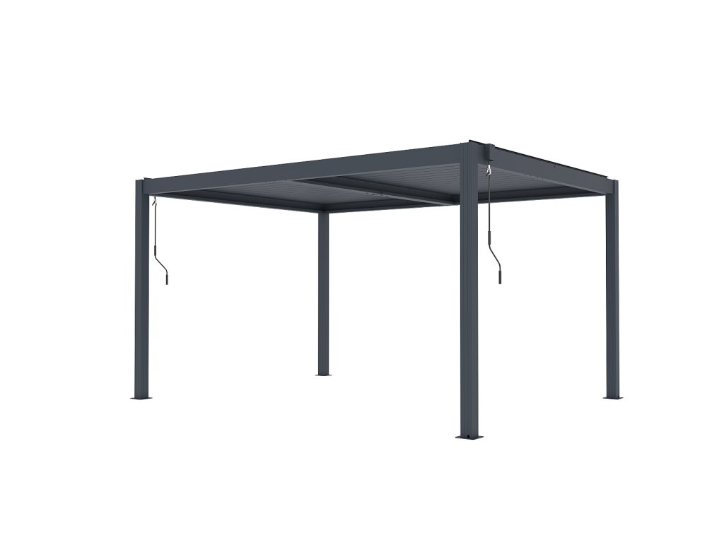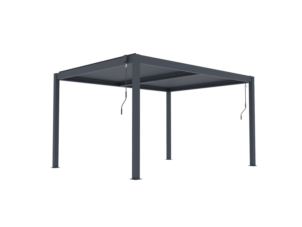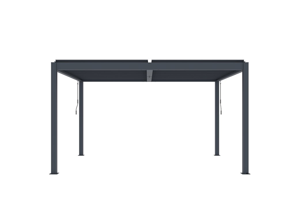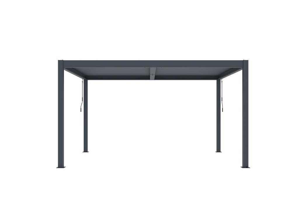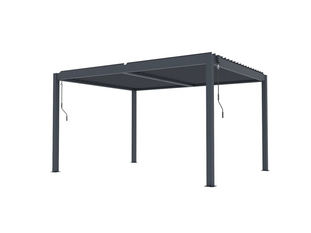 Volně stojící bioklimatická pergola LANITPLAST BASIC o rozměrech 4 x 3 metru je praktickým a elegantním řešením pro zastřešení venkovního posezení na Vaší zahradě. Robustní a stabilní konstrukce v moderním antracitovém odstínu RAL 7016 s matnou povrchovou úpravou se snadno začlení do jakéhokoliv prostředí a nevyžaduje kotvení do stěny. Sloupy i nosné profily jsou vyrobeny z hliníku a otočné lamely z kvalitní oceli, vše je opatřené vypalovaným práškovým lakem (komaxit). Střešní lamely z pozinkované oceli jsou rovněž opatřeny práškovou barvou, která zajišťuje vysokou odolnost vůči povětrnostním podmínkám. Celkem 38 otočných lamel poskytuje spolehlivou ochranu před slunečními paprsky i deštěm. Jejich sklon lze plynule nastavit od zcela uzavřené polohy (0°) až po plné otevření v úhlu 90°. Ovládání lamel je manuální a probíhá pomocí praktické kličky, která je konstruována tak, aby bylo možné ji naklonit a zabránit tak poškození povrchu pergoly při manipulaci. Její umístění navíc umožňuje bezproblémové používání dalších doplňků, jako jsou boční zástěny nebo moskytiéry, aniž by omezovala jejich funkčnost.
