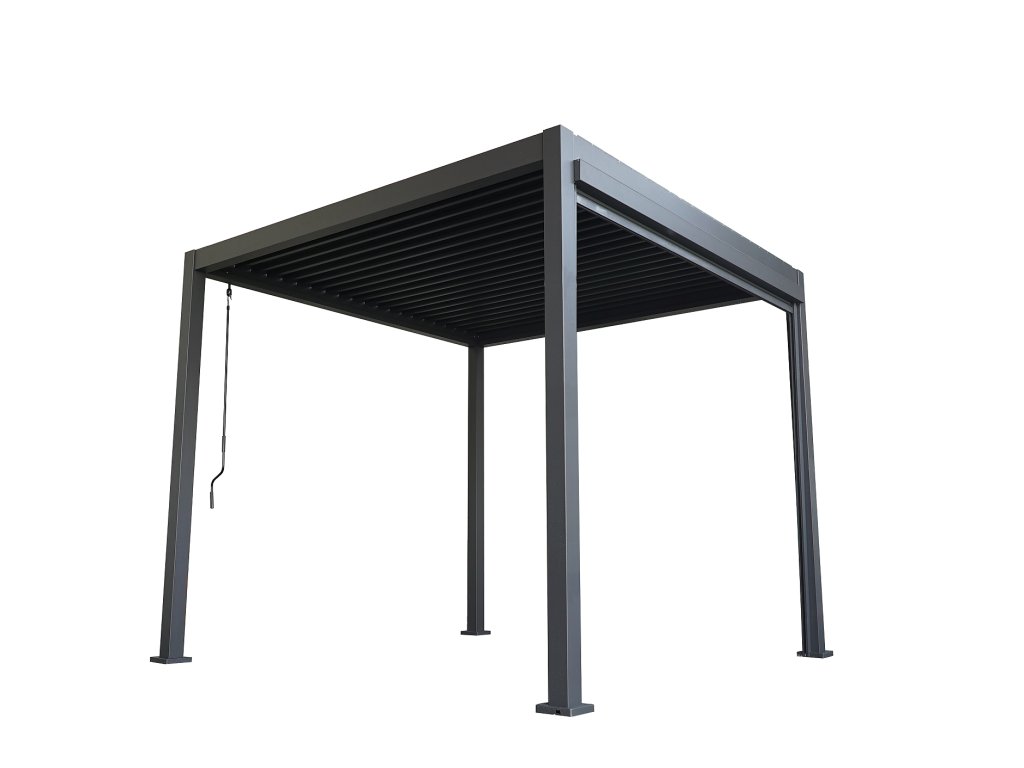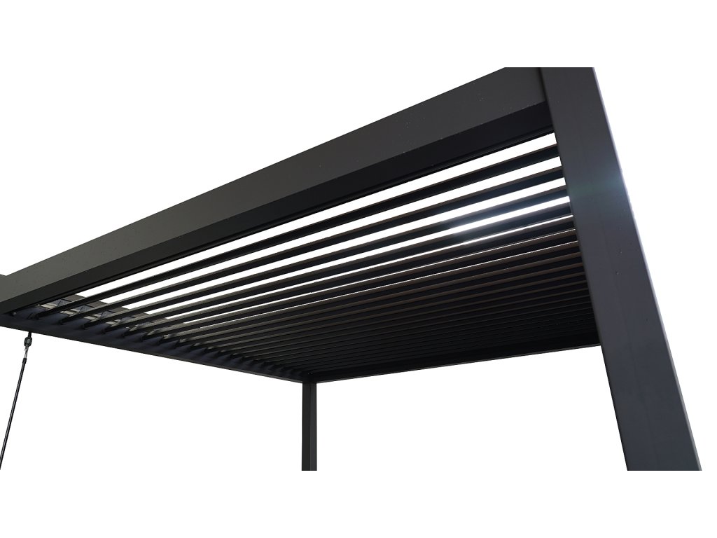 Volně stojící bioklimatická pergola LANITPLAST PREMIUM o rozměrech 5 x 3 metru s plochou střechou je praktickým a elegantním řešením pro zastřešení venkovního posezení na Vaší zahradě. Robustní a stabilní konstrukce v moderním antracitovém odstínu RAL 7043 s matnou povrchovou úpravou se snadno začlení do jakéhokoliv prostředí a nevyžaduje kotvení do stěny. Celá pergola včetně otočných lamel je vyrobena z hliníku, vše je opatřené vypalovaným práškovým lakem (komaxit). Celkem 37 otočných lamel poskytuje spolehlivou ochranu před slunečními paprsky i deštěm. Jejich sklon lze plynule nastavit od zcela uzavřené polohy (0°) až po plné otevření v úhlu 90°. Ovládání lamel je manuální a probíhá pomocí praktické kličky, která je konstruována tak, aby bylo možné ji naklonit a zabránit tak poškození povrchu pergoly při manipulaci. Její umístění navíc umožňuje bezproblémové používání dalších doplňků, jako jsou boční zástěny nebo moskytiéry, aniž by omezovala jejich funkčnost.