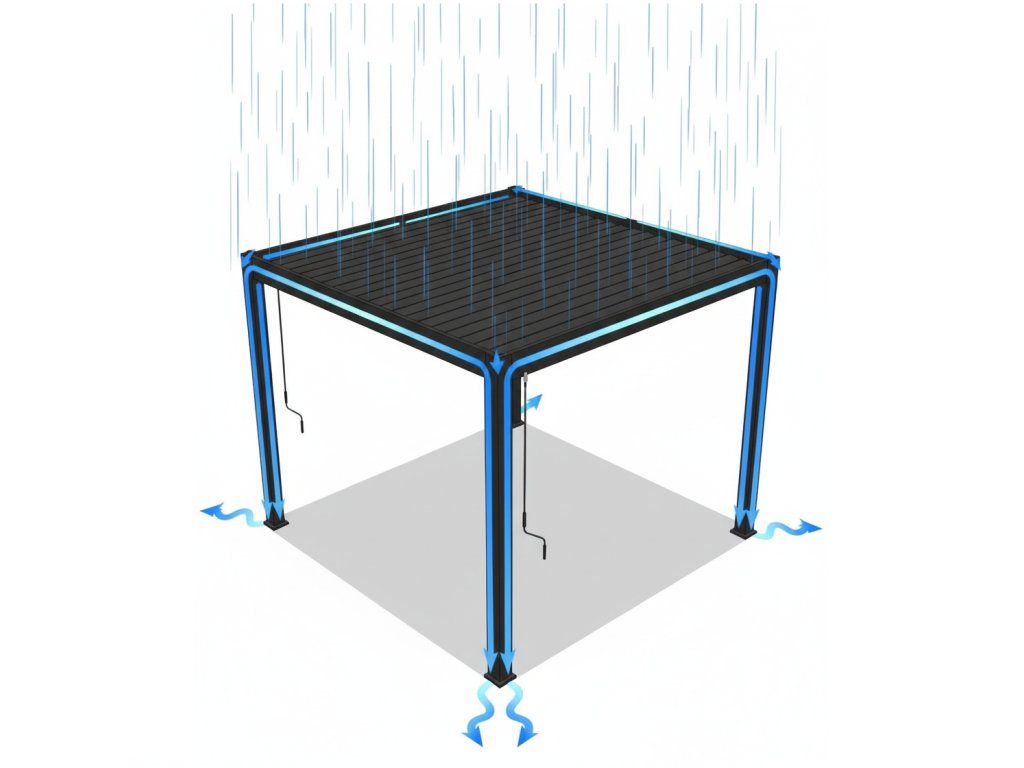 Primárním úkolem střešních lamel bioklimatické pergoly LANITPLAST PREMIUM je nastavení intenzity zastínění slunce, nicméně otočná střecha v zavřeném stavu zajistí i ochranu před deštěm. Při úplném uzavření střechy jsou totiž střešní lamely do sebe vzájemně zaklesnuty (systém pero drážka). Odvod vody je řešen jedinečným drenážním systémem integrovaným přímo do konstrukce. V zimním období je nutné ponechat lamely ve svislé otevřené poloze, jinak by mohlo dojít k jejich poškození. Přesto zvládnou unést sněhovou pokrývku o výšce 40–50 cm, což odpovídá zatížení přibližně 85 kg/m². Při správném ukotvení a otevřené střeše pergola odolá větru až do stupně 12 Beaufortovy stupnice (hurikán).