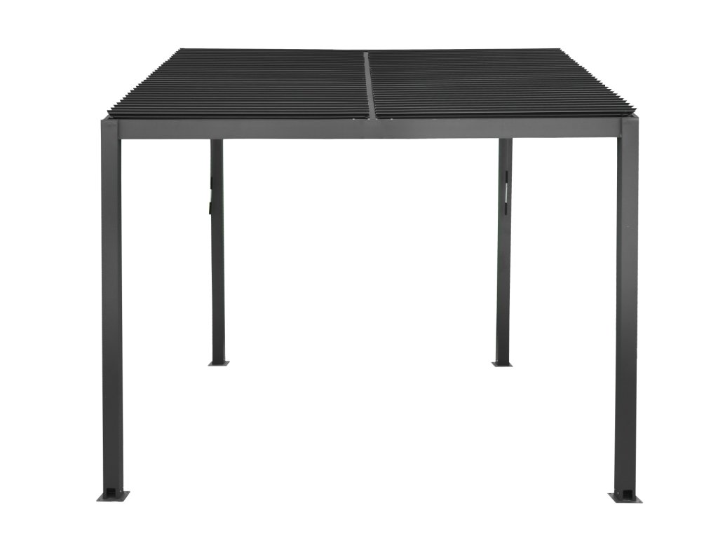 Volně stojící bioklimatická pergola LANITPLAST STANDARD o rozměrech 3 x 3 metru se šikmou střechou je praktickým a elegantním řešením pro zastřešení venkovního posezení na Vaší zahradě. Robustní a stabilní konstrukce v moderním antracitovém odstínu RAL 7024 s matnou povrchovou úpravou se snadno začlení do jakéhokoliv prostředí a nevyžaduje kotvení do stěny. Celá pergola včetně otočných lamel je vyrobena z hliníku, vše je opatřené vypalovaným práškovým lakem (komaxit). Celkem 64 otočných lamel poskytuje spolehlivou ochranu před slunečními paprsky i deštěm. Jejich sklon lze plynule nastavit od zcela uzavřené polohy (0°) až po plné otevření v úhlu 90°. Ovládání lamel je manuální a probíhá pomocí praktické kličky, která je konstruována tak, aby bylo možné ji naklonit a zabránit tak poškození povrchu pergoly při manipulaci. Její umístění navíc umožňuje bezproblémové používání dalších doplňků, jako jsou boční zástěny nebo moskytiéry, aniž by omezovala jejich funkčnost.