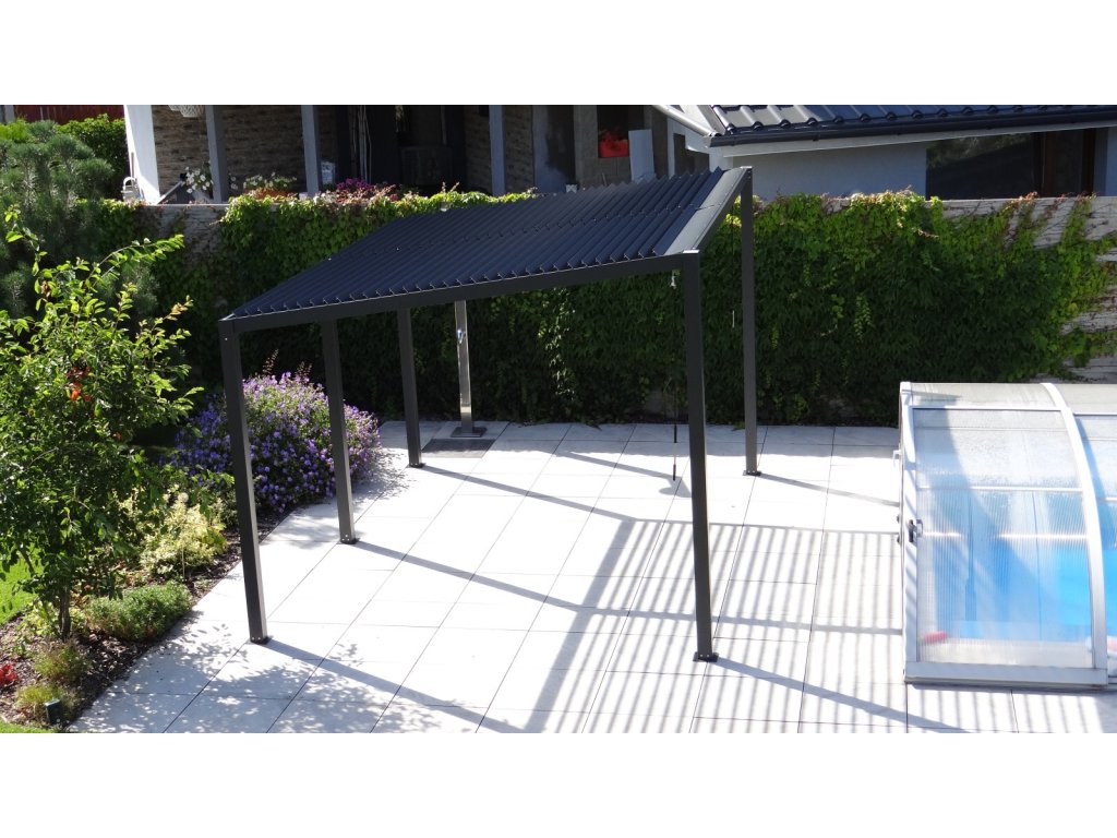 Volně stojící bioklimatická pergola LANITPLAST STANDARD o rozměrech 4 x 3 metru se šikmou střechou je praktickým a elegantním řešením pro zastřešení venkovního posezení na Vaší zahradě. Robustní a stabilní konstrukce v moderním antracitovém odstínu RAL 7024 s matnou povrchovou úpravou se snadno začlení do jakéhokoliv prostředí a nevyžaduje kotvení do stěny. Celá pergola včetně otočných lamel je vyrobena z hliníku, vše je opatřené vypalovaným práškovým lakem (komaxit). Celkem 64 otočných lamel poskytuje spolehlivou ochranu před slunečními paprsky i deštěm. Jejich sklon lze plynule nastavit od zcela uzavřené polohy (0°) až po plné otevření v úhlu 90°. Ovládání lamel je manuální a probíhá pomocí praktické kličky, která je konstruována tak, aby bylo možné ji naklonit a zabránit tak poškození povrchu pergoly při manipulaci. Její umístění navíc umožňuje bezproblémové používání dalších doplňků, jako jsou boční zástěny nebo moskytiéry, aniž by omezovala jejich funkčnost.