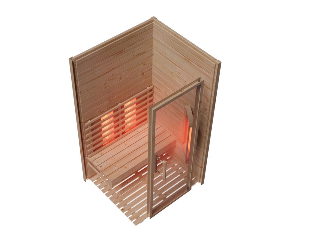 - sauna je vyrobená ze širších vodorovných dřevěných palubek se skleněnými jednokřídlými dveřmi