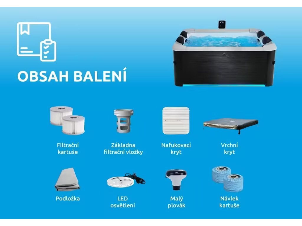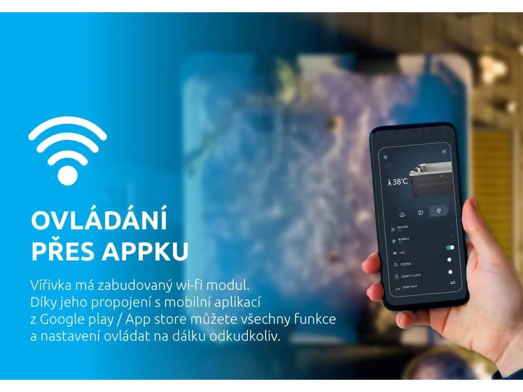 - Funkce: možnost provozu v zimě, ozonová dezinfekce, UV dezinfekce vody, WiFi ovládání vířivky