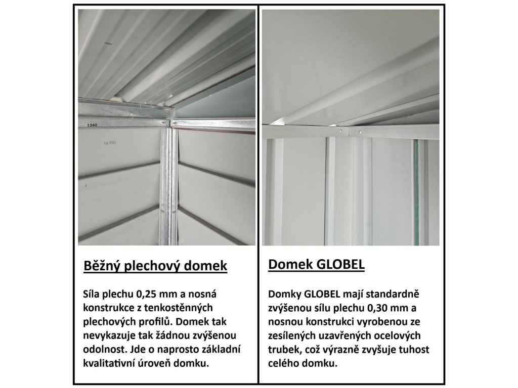 Všechny domky GLOBEL mají standardně zvýšenou sílu plechu 0,30 mm a nosnou kostru mají vyrobenou ze zesílených uzavřených ocelových trubek (běžné domky na českém a slovenském trhu mívají nosnou kostru pouze z tenkostěnné profilované ocelové lišty). Tím je zajištěna maximální odolnost a stabilita celého domku. Potvrzením použití silných ocelových plechů a masivní nosné konstrukce je i relativně vyšší hmotnost domku ve srovnání s rozměrově shodnou konkurencí. Domky GLOBEL jsou proto výrazně robustnější než ostatní domky jiných značek a mají o cca 20% větší hmotnost.