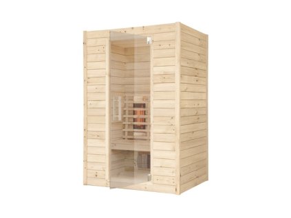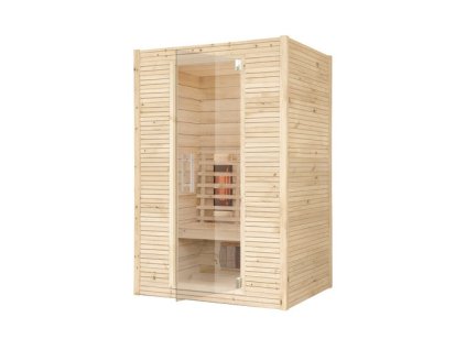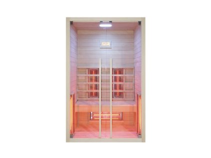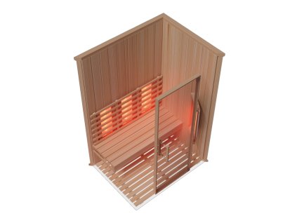 Infrasauna pro 2 osoby, 131×112×198 cm; 6× redlight zářič, dřevo - jedlovec (hemlock), regulace teploty a času, LED terapie, FM rádio, bluetooth, USB.