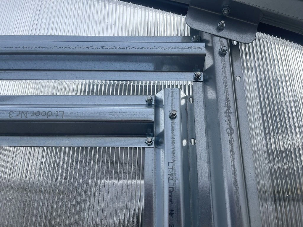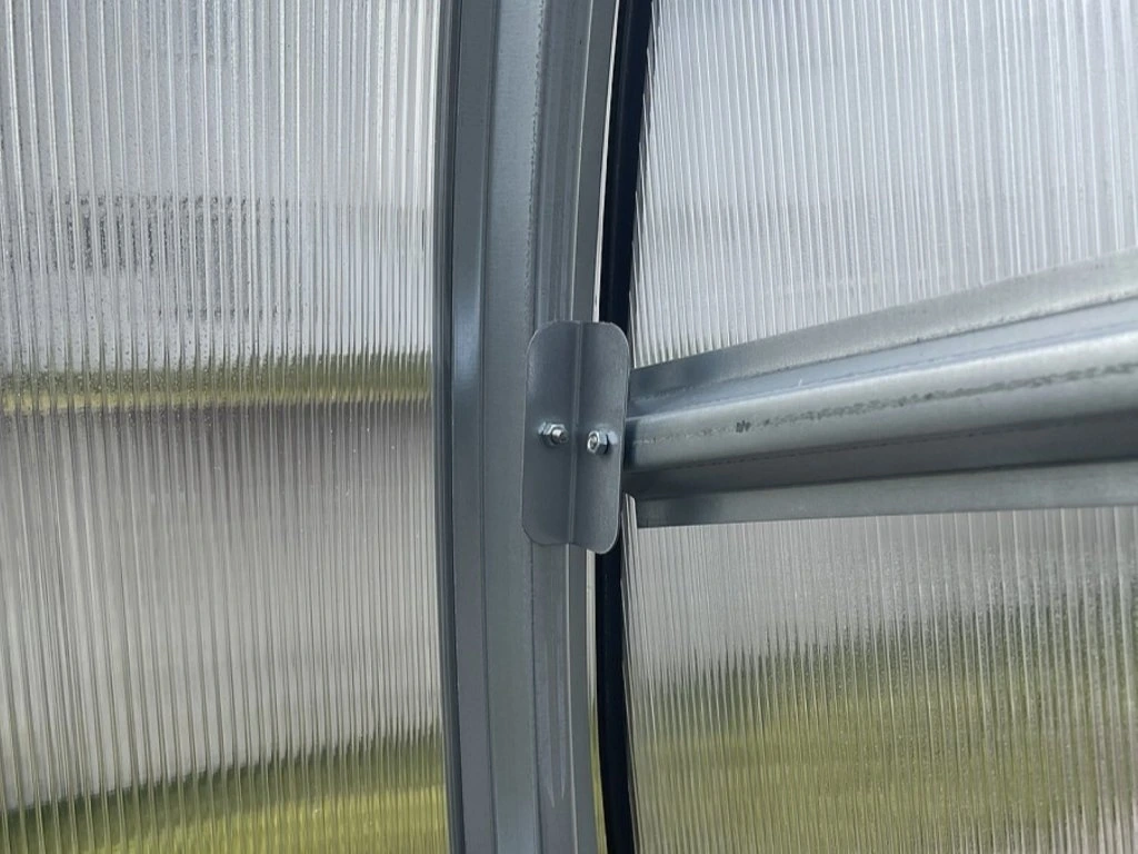 Tento model skleníku obsahuje ocelové vodorovné spojovací lišty na plastové prosklení, takže polykarbonátové desky jsou dodávané už předřezáné na menší formáty (max. 1,05 x 2 m) a zabalené v kartonu. Z těchto menších formátů lze už velice jednoduše dořezat potřebné zaoblené dílce pro opláštění. Nemusíte tak složitě manipulovat s celými velkými polykarbonátovými deskami. Skleník lze i mnohem jednodušeji uskladnit. DOPORUČUJEME!