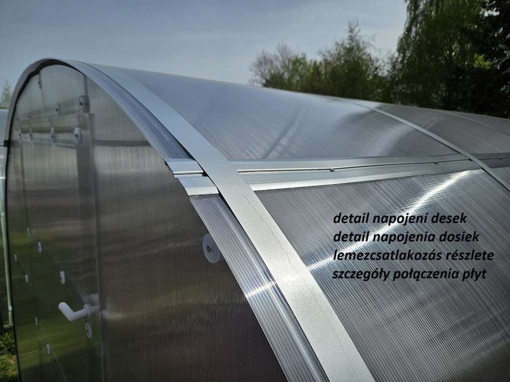 Tento model skleníku obsahuje ocelové vodorovné spojovací lišty na plastové prosklení, takže polykarbonátové desky jsou dodávané už předřezáné na menší formáty (max. 1,05 x 2 m) a zabalené v kartonu. Z těchto menších formátů lze už velice jednoduše dořezat potřebné zaoblené dílce pro opláštění. Nemusíte tak složitě manipulovat s celými velkými polykarbonátovými deskami. Skleník lze i mnohem jednodušeji uskladnit. DOPORUČUJEME!