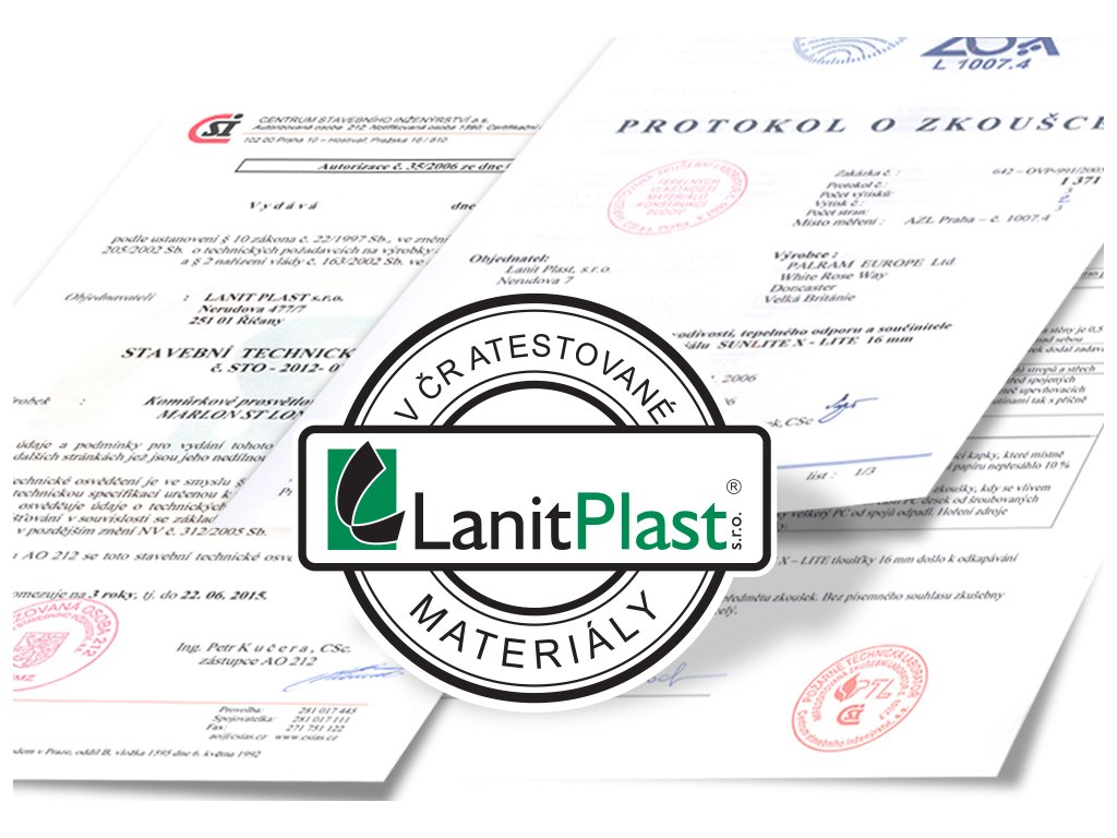 Polykarbonát - prémiový britský dvoustěnný polykarbonát 6 mm se silným UV filtrem (proto na slunci nežloutne a nekřehne). Z důvodu zajištění maximální kvality skleníku dodáváme ke konstrukci prosklení z kvalitního polykarbonátu MARLON (výrobce Brett Martin Velká Británie), který v ČR prošel náročnými testy ve státem akreditovaných zkušebnách jako stavební materiál. Navíc disponuje zkušebním protokolem ze Státního zdravotního ústavu Praha, který potvrzuje, že se z polykarbonátu neuvolňují žádné škodlivé látky. Můžete tak nerušeně pěstovat zeleninu bez obav o své zdraví. Smluvní prodloužená záruka 10 let na nerozbitnost polykarbonátu krupobitím je u skleníků od LANIT PLASTU samozřejmostí.