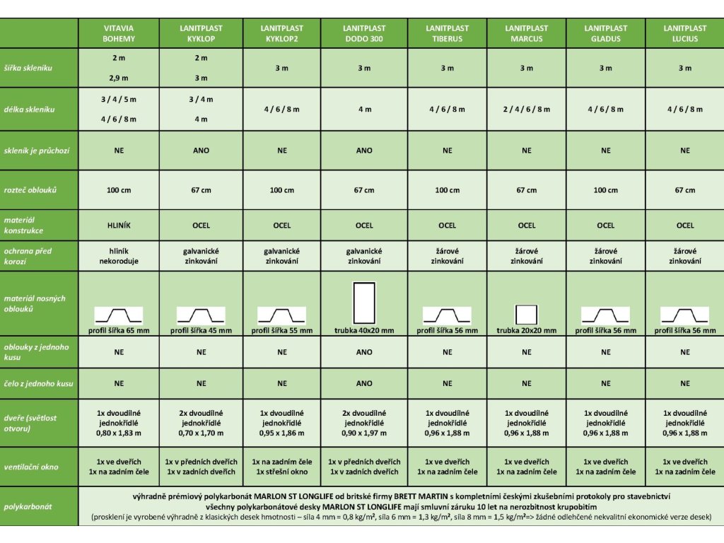 Polykarbonát - prémiový britský dvoustěnný polykarbonát 4 mm se silným UV filtrem (proto na slunci nežloutne a nekřehne). Z důvodu zajištění maximální kvality skleníku dodáváme ke konstrukci prosklení z kvalitního polykarbonátu MARLON (výrobce Brett Martin Velká Británie), který v ČR prošel náročnými testy ve státem akreditovaných zkušebnách jako stavební materiál. Navíc disponuje zkušebním protokolem ze Státního zdravotního ústavu Praha, který potvrzuje, že se z polykarbonátu neuvolňují žádné škodlivé látky. Můžete tak nerušeně pěstovat zeleninu bez obav o své zdraví. Smluvní prodloužená záruka 10 let na nerozbitnost polykarbonátu krupobitím je u skleníků od LANIT PLASTU samozřejmostí.